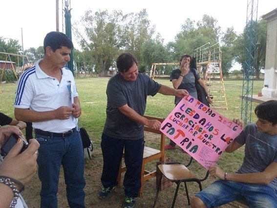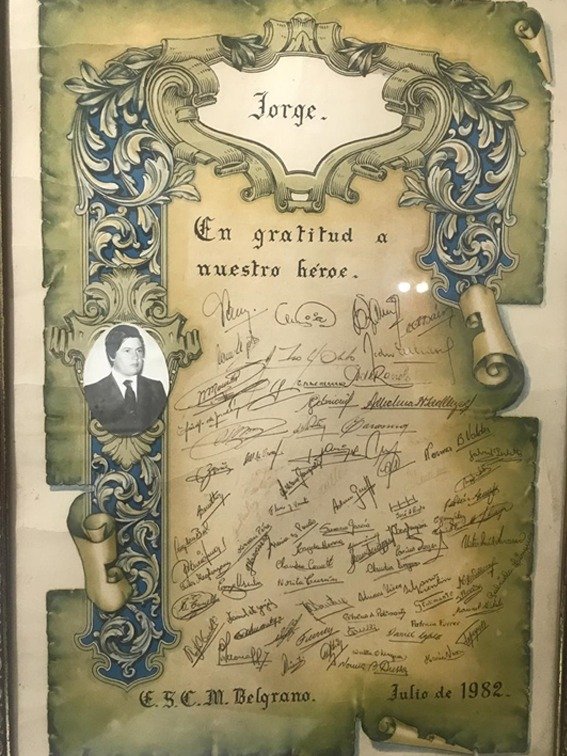 La escuela de su adolescencia lo homenajeó y a través de él a todos los ex combatientes colocando el nombre Héroes de Malvinas a un aula del Instituto y con un pergamino recordatorio.
